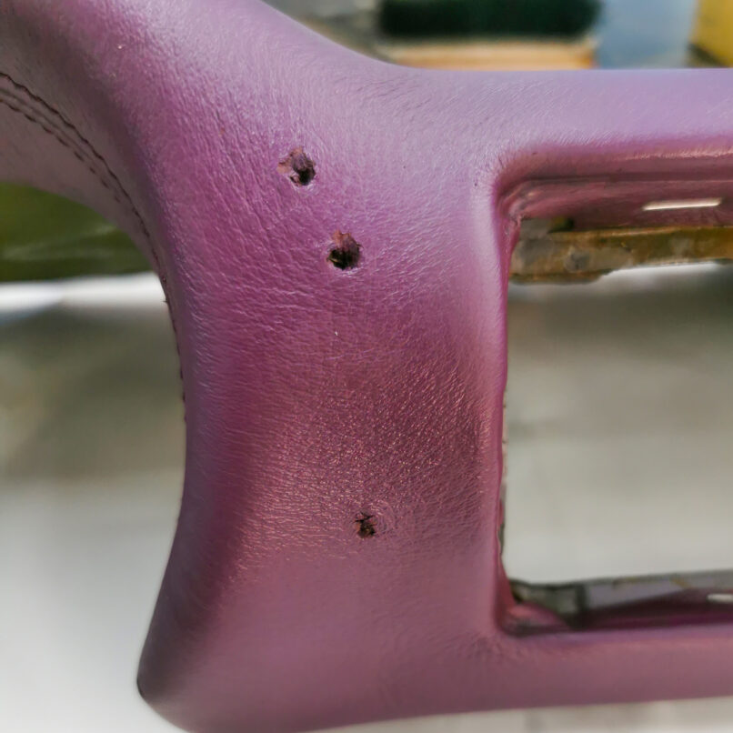 - Fotel kierowcy – uszkodzona, pęknięta kedra była poważnym problemem. Precyzyjne sklejenie i wzmocnienie elementu pozwoliło dopiero potem na bezpieczne lakierowanie skóry i całego fotela.