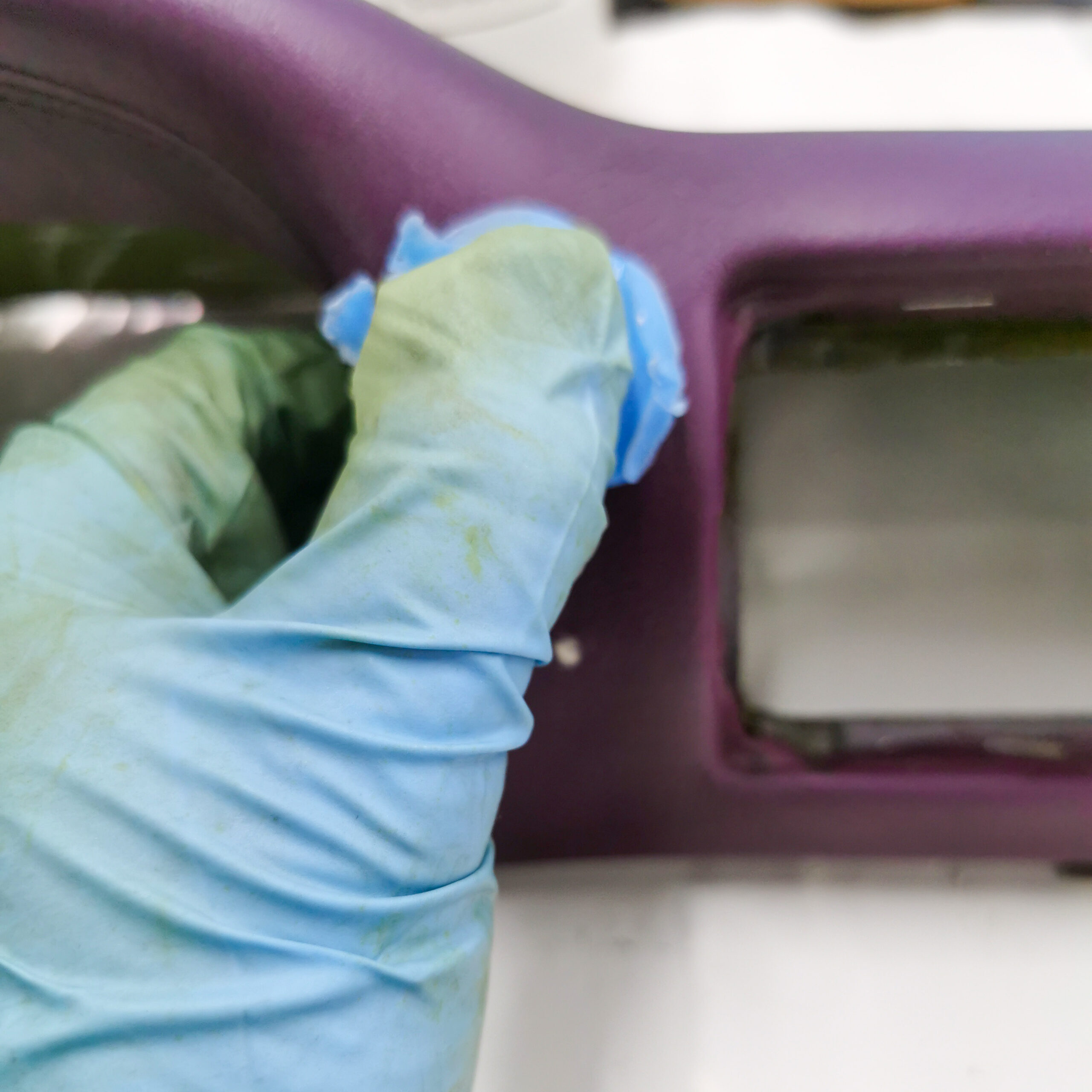 - Deska rozdzielcza – nosiła ślady po starym zestawie głośnomówiącym. Dziury nie mogły pozostać, dlatego je zakleiłem, wypełniłem, przygotowałem wycisk i na jego podstawie odtworzyłem fakturę powierzchni skóry. Na koniec całość polakierowałem tak, aby idealnie zlała się z otoczeniem.