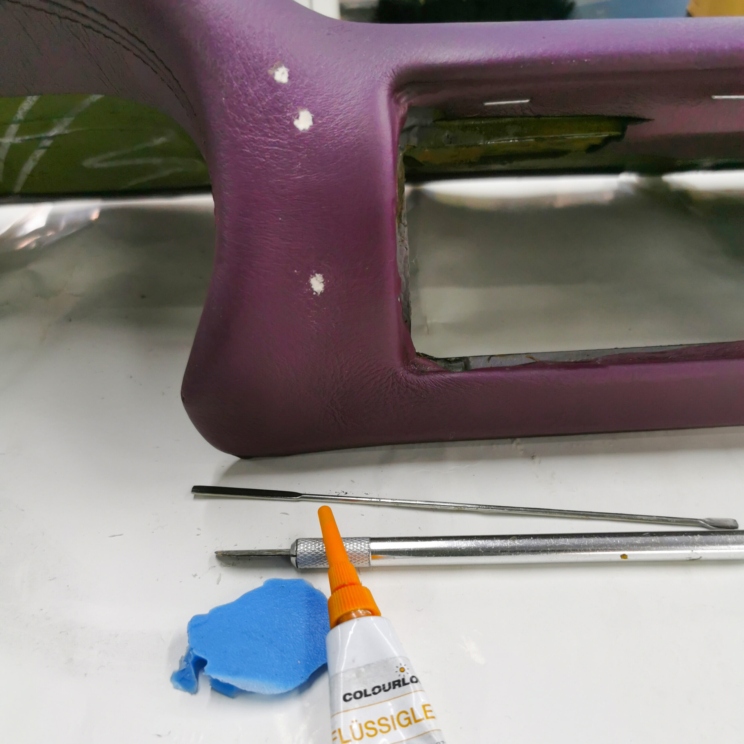 - Fotel kierowcy – uszkodzona, pęknięta kedra była poważnym problemem. Precyzyjne sklejenie i wzmocnienie elementu pozwoliło dopiero potem na bezpieczne lakierowanie skóry i całego fotela.